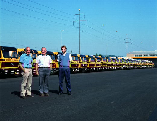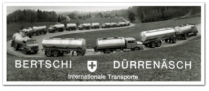 Ein Blick in die Firmengeschichte zeigt, wie es dazu kam. Die ersten Aktivitäten der Firma Bertschi gehen ins späte 19. Jahrhundert zurück, als der Urgrossvater der Gründer zuerst mit Pferden und dann mit einem Traktor lokale und regionale Transporte durchführte. 1956 folgte die Gründung der Einzelfirma Bertschi unter der Regie von Hans. Es sind die wichtigsten, aber auch härtesten Jahre, in denen sich die Firma dank Pioniergeist, Weitsichtigkeit und Entschlossenheit erfolgreich im Transport- und Chemiesegment positionieren konnte. 1964 folgte Rolf dem Ruf seines Bruders Hans und kehrte aus den USA zurück, um als Partner die intensive Aufbauphase zu unterstützen. Gemeinsam gründeten sie 1964 die Bertschi Dürrenäsch AG. Der gelernte Diplom-Ingenieur Rolf Bertschi übernahm die Entwicklung der Fahrzeugflotte. Der "Tüftler" fand immer neue Wege, diese kontinuierlich weiter zu entwickeln und somit der Konkurrenz stets einen Schritt voraus zu sein... die ideale Ergänzung zu Hans Bertschi, der als Geschäftsführer die kommerziellen und betrieblichen Belange so geschickt leitete, dass viele grosse Chemiefirmen auf das seriöse und qualitativ exzellente Dürrenäscher Unternehmen aufmerksam wurden. So übernahm die Firma Bertschi bereits 1958 erste Sendungen ab BASF Ludwigshafen zu Novospan in Klingnau. Mitte der 60er Jahre erprobte das noch junge Unternehmen erste Kombinierte Transporte für die BASF nach Italien. Aus der Not machten die zwei Brüder eine Tugend. Um im Winter die Alpen schnell und sicher zu überqueren, verluden sie ab 1964 die Strassenfahrzeuge auf Bahnwagen und wurden so zu Vorreitern des heute europaweit erfolgreichen Kombinierten Verkehrs. So erstaunt es auch nicht, dass die Bertschi AG federführend bei der Gründung der Firma Hupac war. Gemeinsam mit weiteren 4 Unternehmen gründeten sie 1967 den Schweizer Kombi-Operateur Hupac und wurden somit zu Wegbereitern für die Schweizer Verlagerungspolitik.
